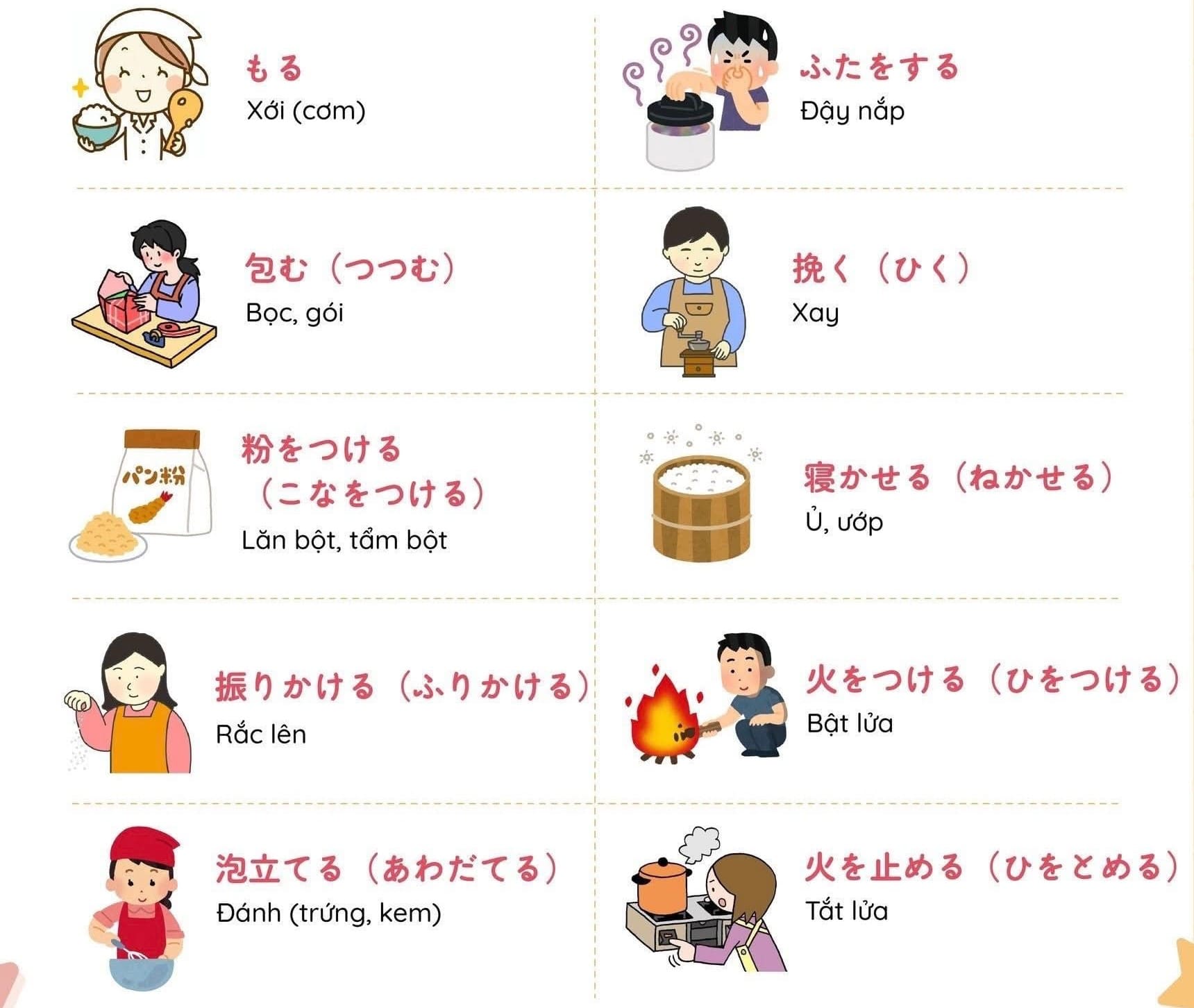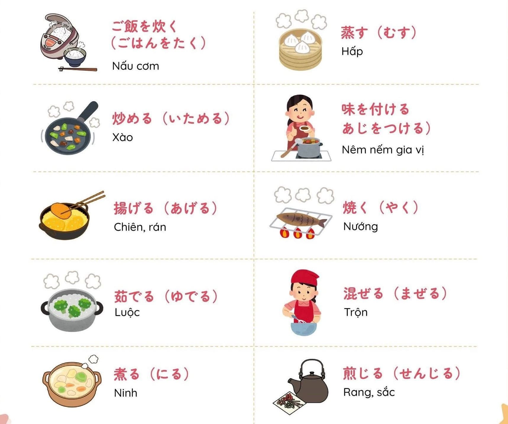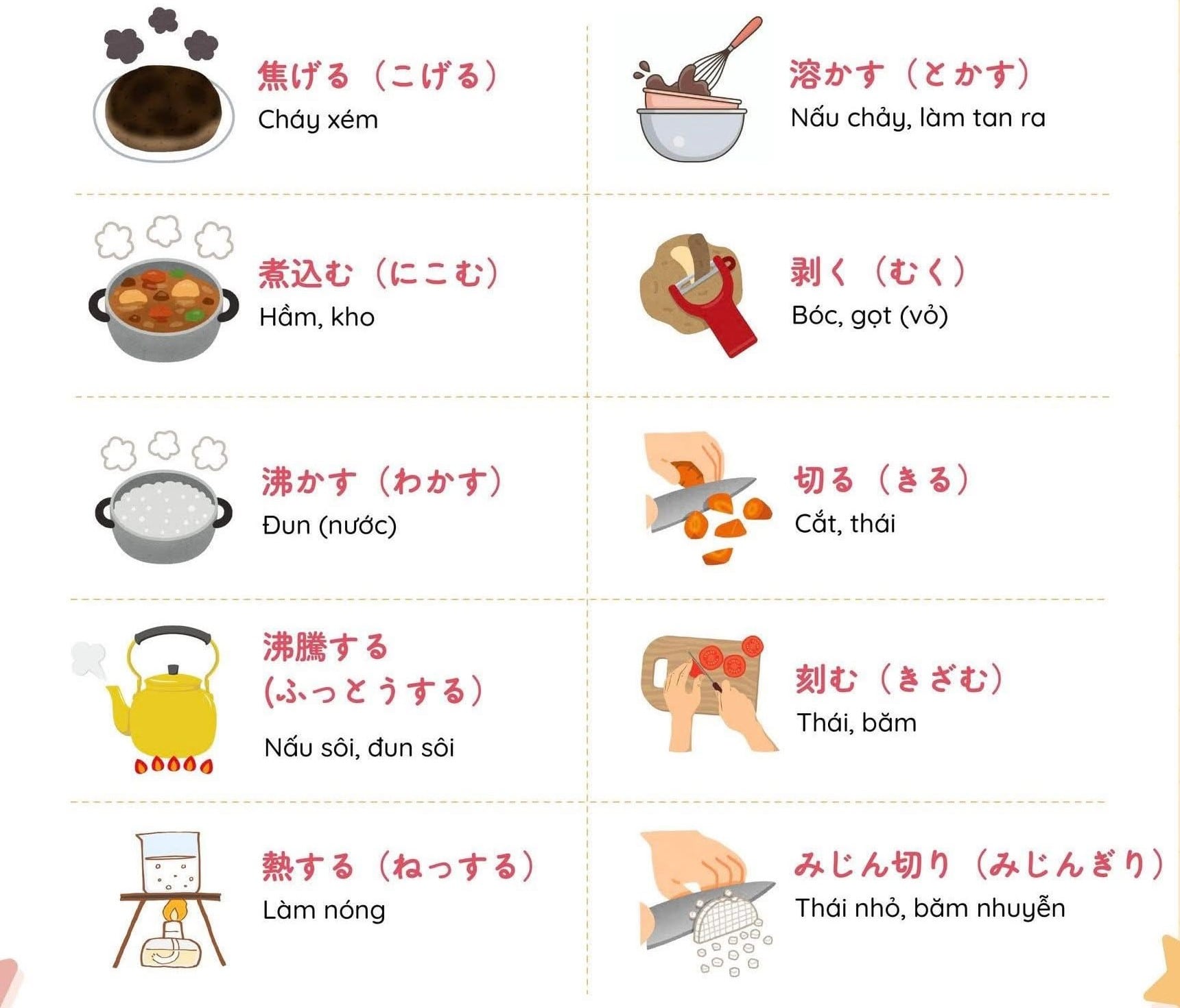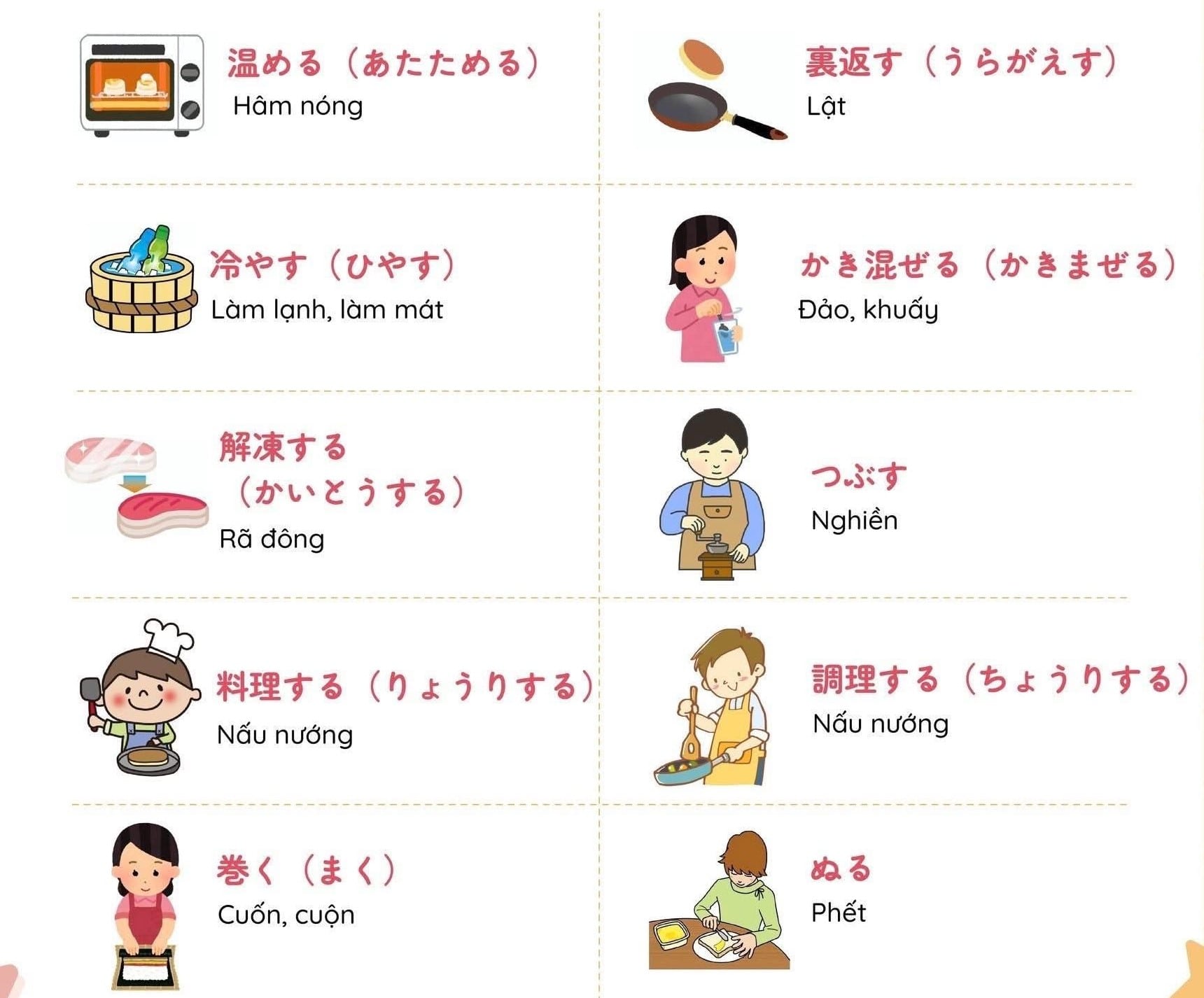 50 Động Từ tiếng Nhật dùng trong Nấu Ăn Từ vựng tiếng Nhật 50 Động Từ tiếng Nhật dùng trong Nấu Ăn 50 ĐỘNG TỪ NẤU ĂN TRONG TIẾNG NHẬT . 2025-07-22 adminh Share