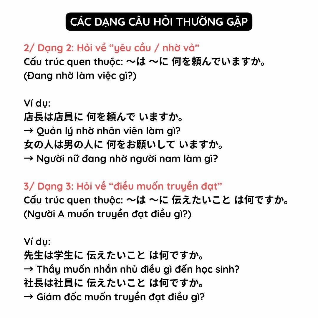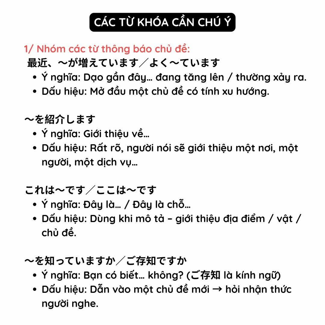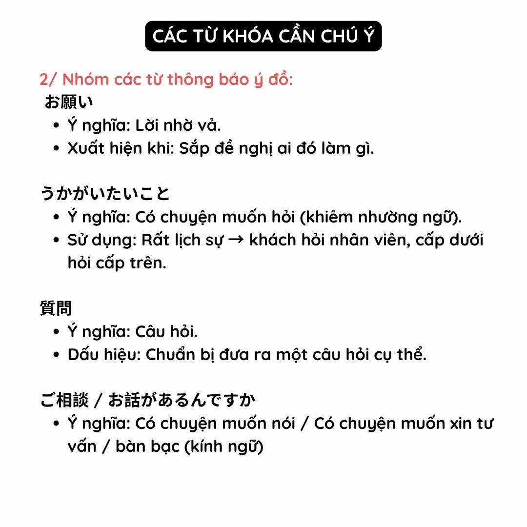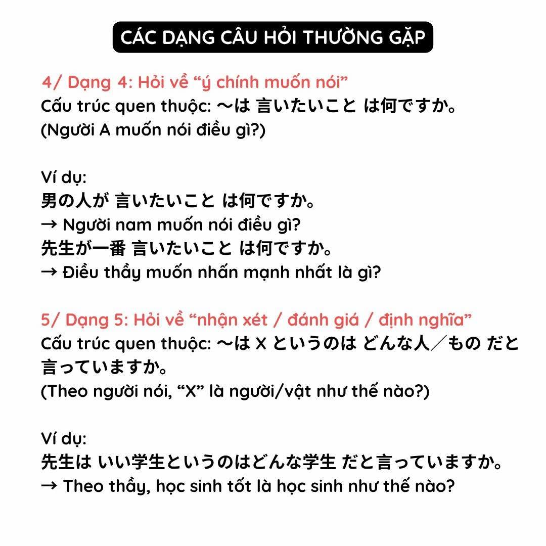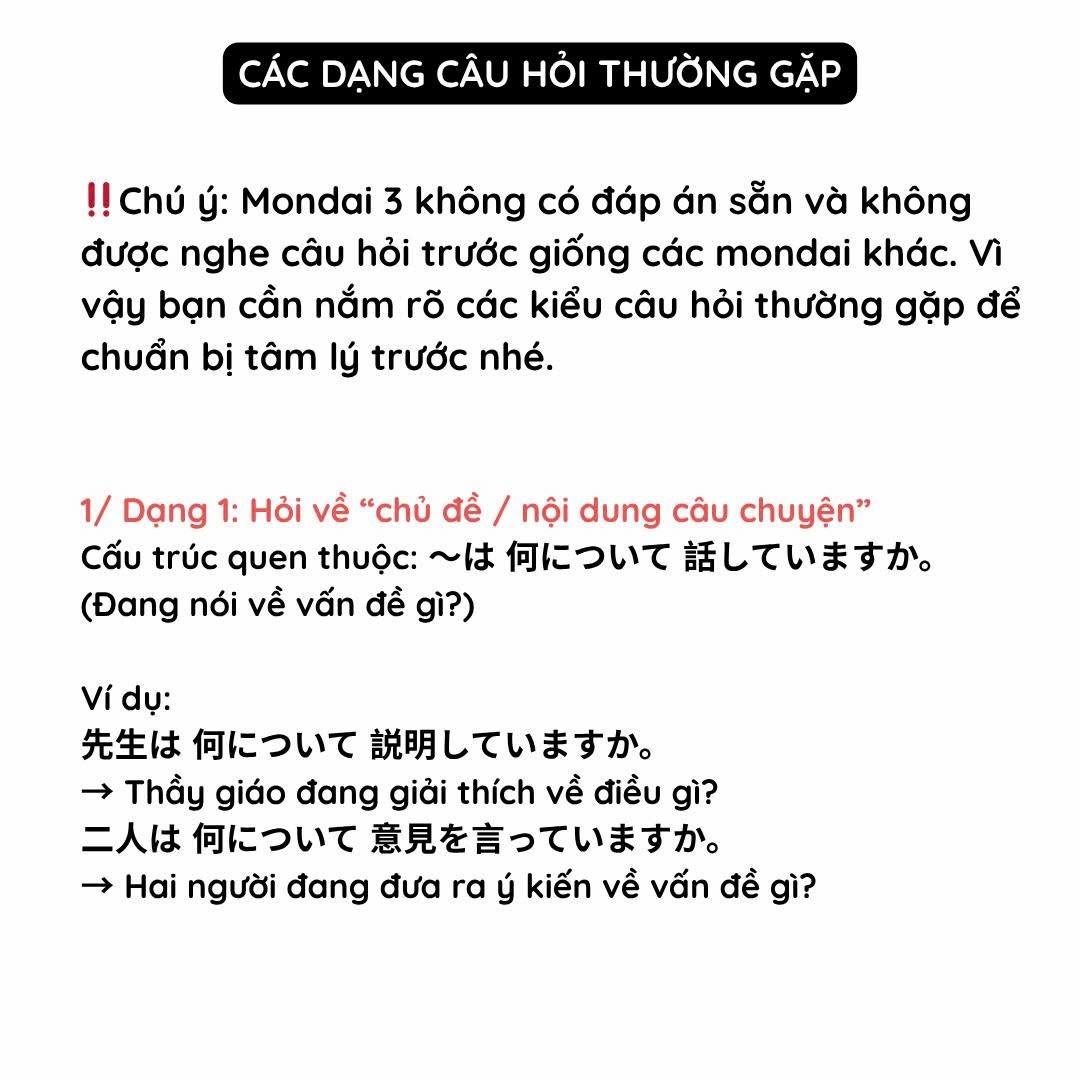 Chú ý: Mondai 3 không có đáp án sẵn và không được nghe câu hỏi trước giống các mondai khác. Vì vậy bạn cần nắm rõ các kiểu câu hỏi thường gặp để chuẩn bị tâm lý trước nhé.
