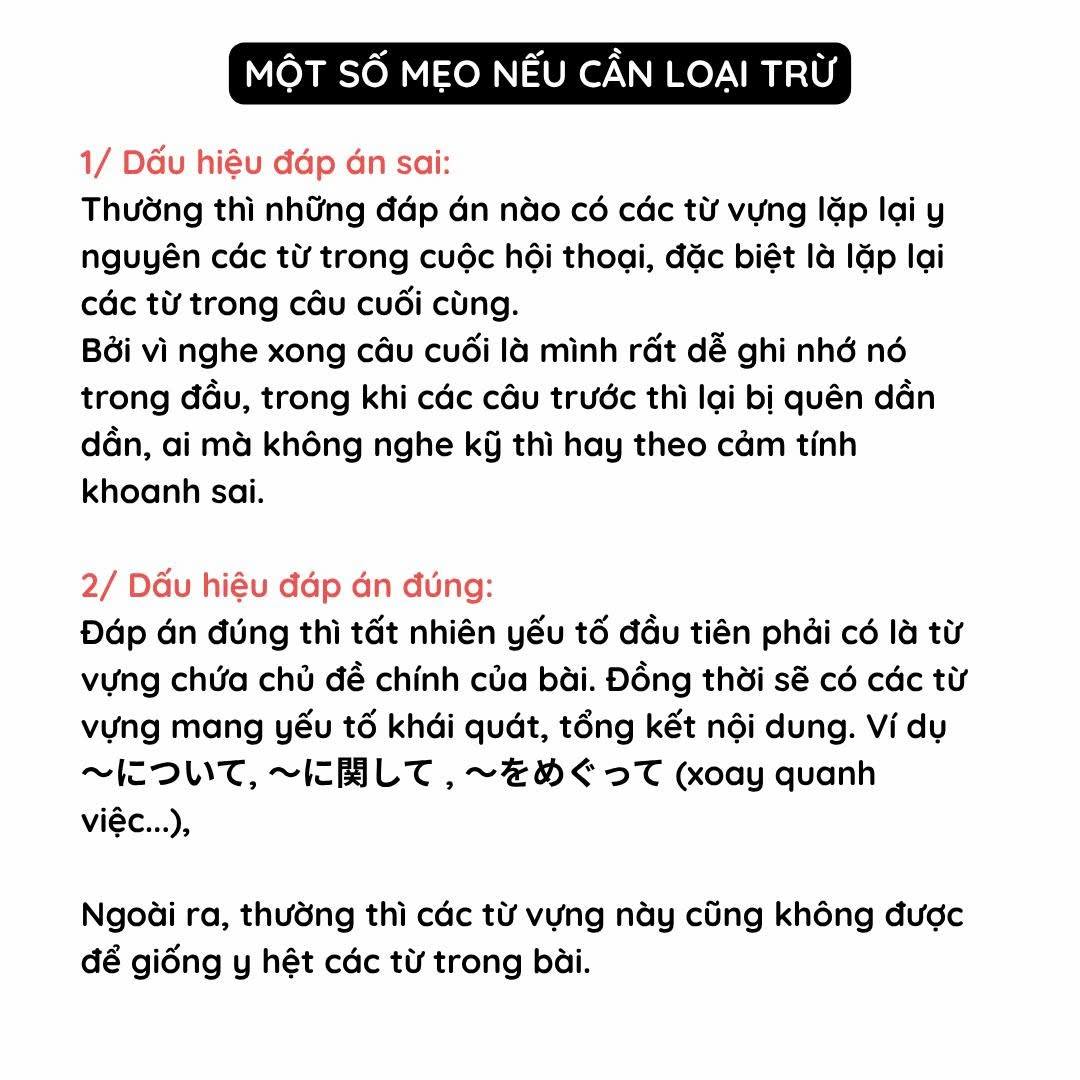Khác với mondai 1, 2 thường hỏi về tiểu tiết, hành động, sự việc cụ thể nào đó, thì mondai 3 lại khó hơn một chút khi hỏi về nội dung khái quát của đoạn hội thoại nhé!