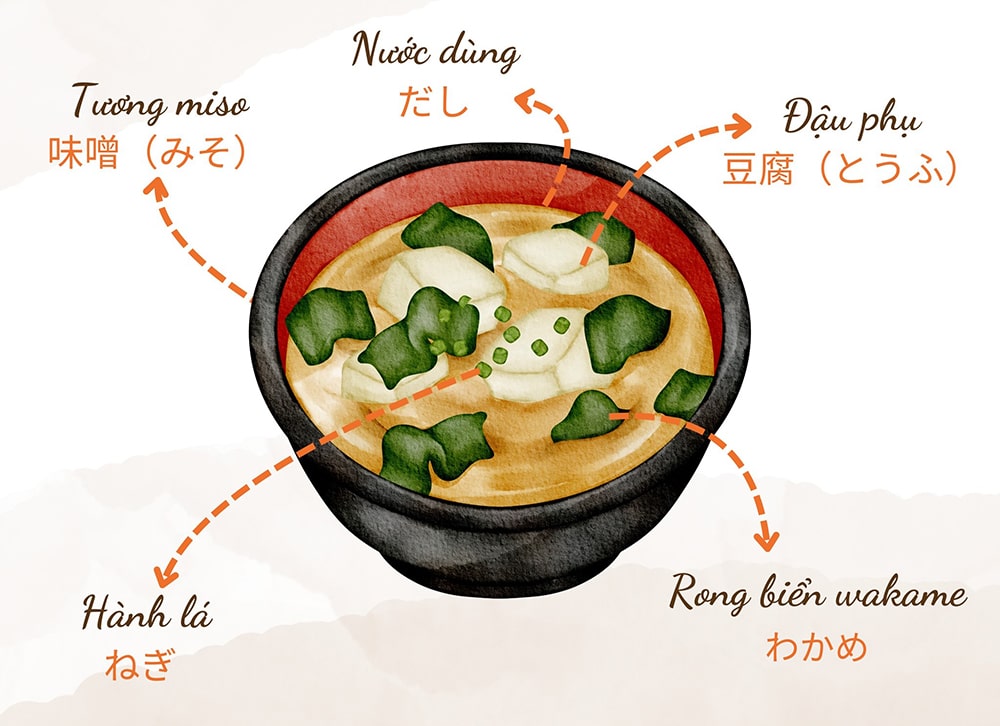 Miso là một món ăn được làm từ loại nước dùng dashi và loại tương miso được chế biến từ đậu nành. Một chén soup miso sẽ có các thành phần cơ bản như: nori (rong biển), hành lá, đậu hũ, nấm và cần tây… Đặc điểm của súp Miso là có vị ngọt, chứa nhiều dưỡng chất và có “sức mạnh” sưởi ấm cơ thể trong mùa đông. Người Nhật cũng có thể dùng món này trong các mùa khác nữa.