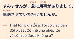 Top 5 câu nói “Xin về sớm” trong tiếng Nhật Chia sẻ tới mọi người 5 mẫu câu dùng để xin về sớm. Ngoài ra còn nhiều lý do khác tùy vào trường hợp mà mọi người có thể dựa vào mẫu câu rồi thay đổi lý do là được …