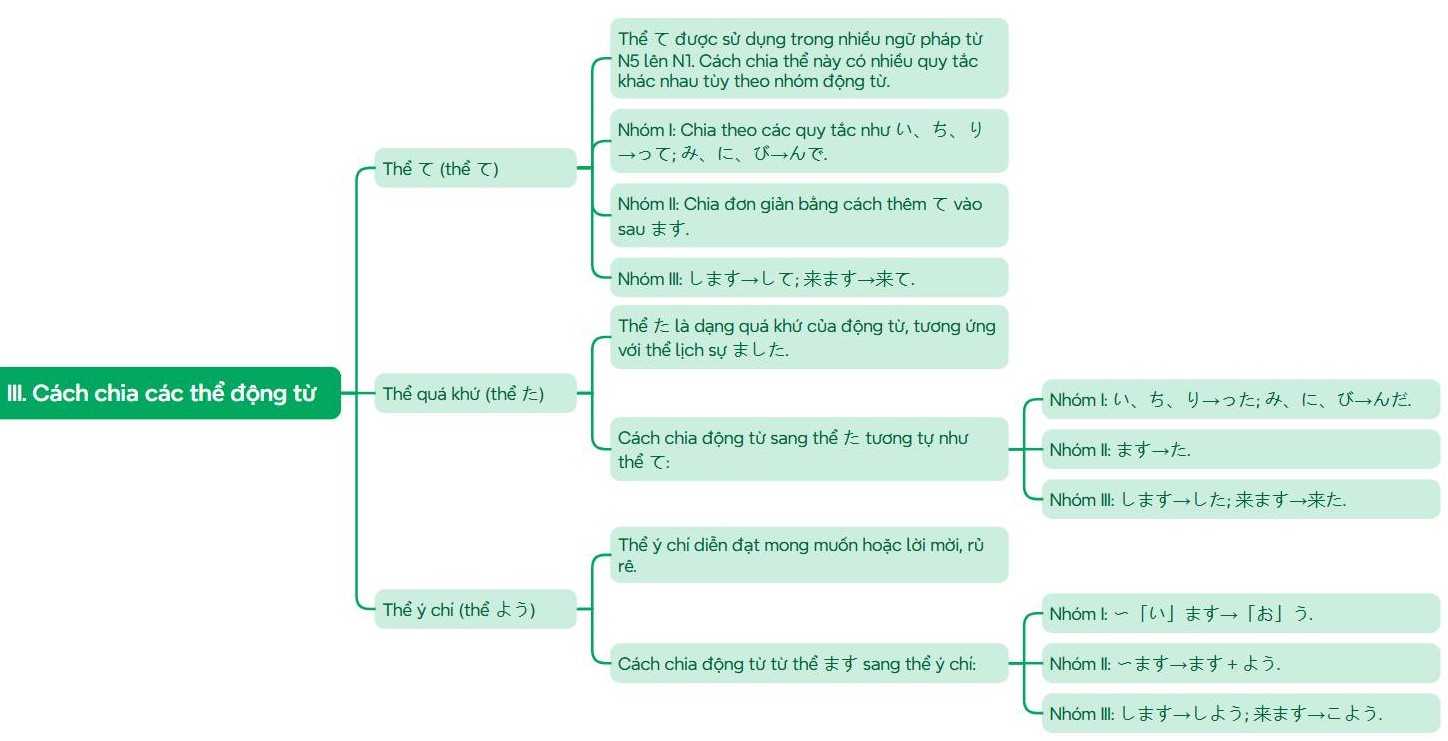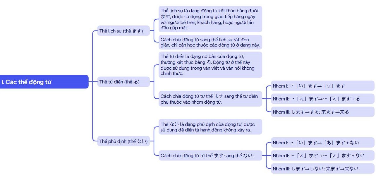 Cùng học cách chia các thể động từ trong tiếng Nhật qua sơ đồ dễ hiểu.