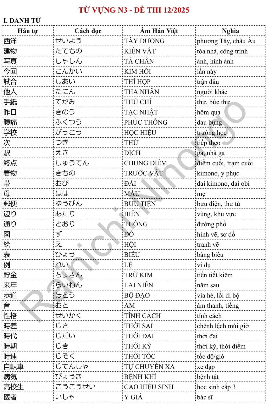 Danh sách từ vựng tiếng Nhật đã xuất hiện trong đề thi JLPT N3 – 12/2025.