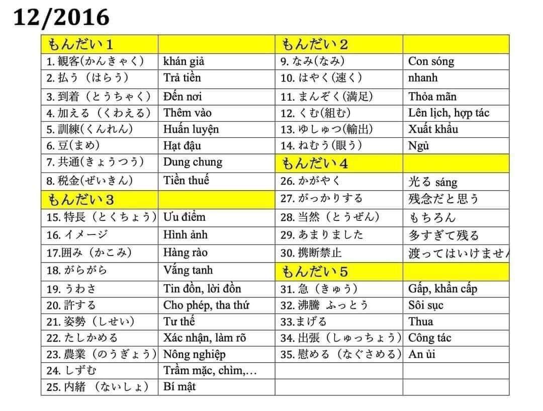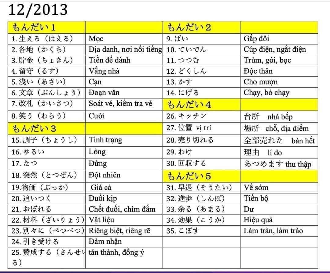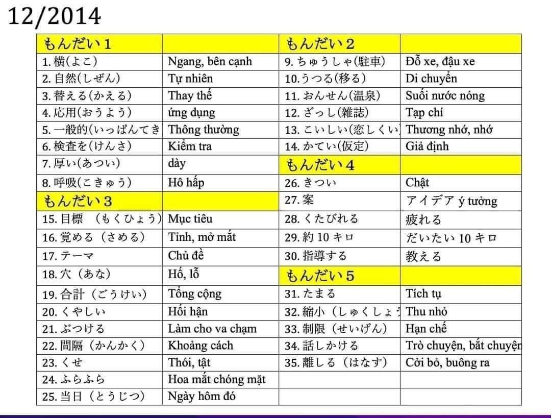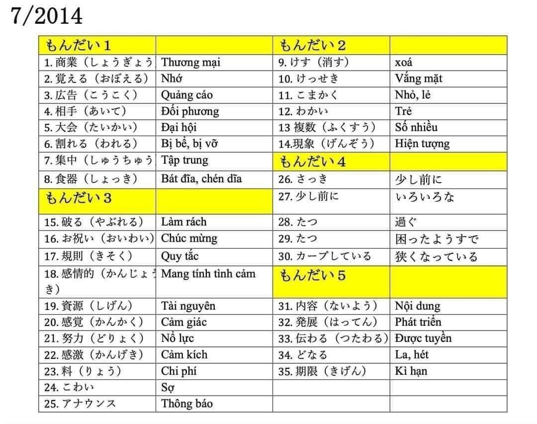 Từ vựng tiếng Nhật N3 đã từng xuất hiện trong JLPT (7/2013-12/2017)